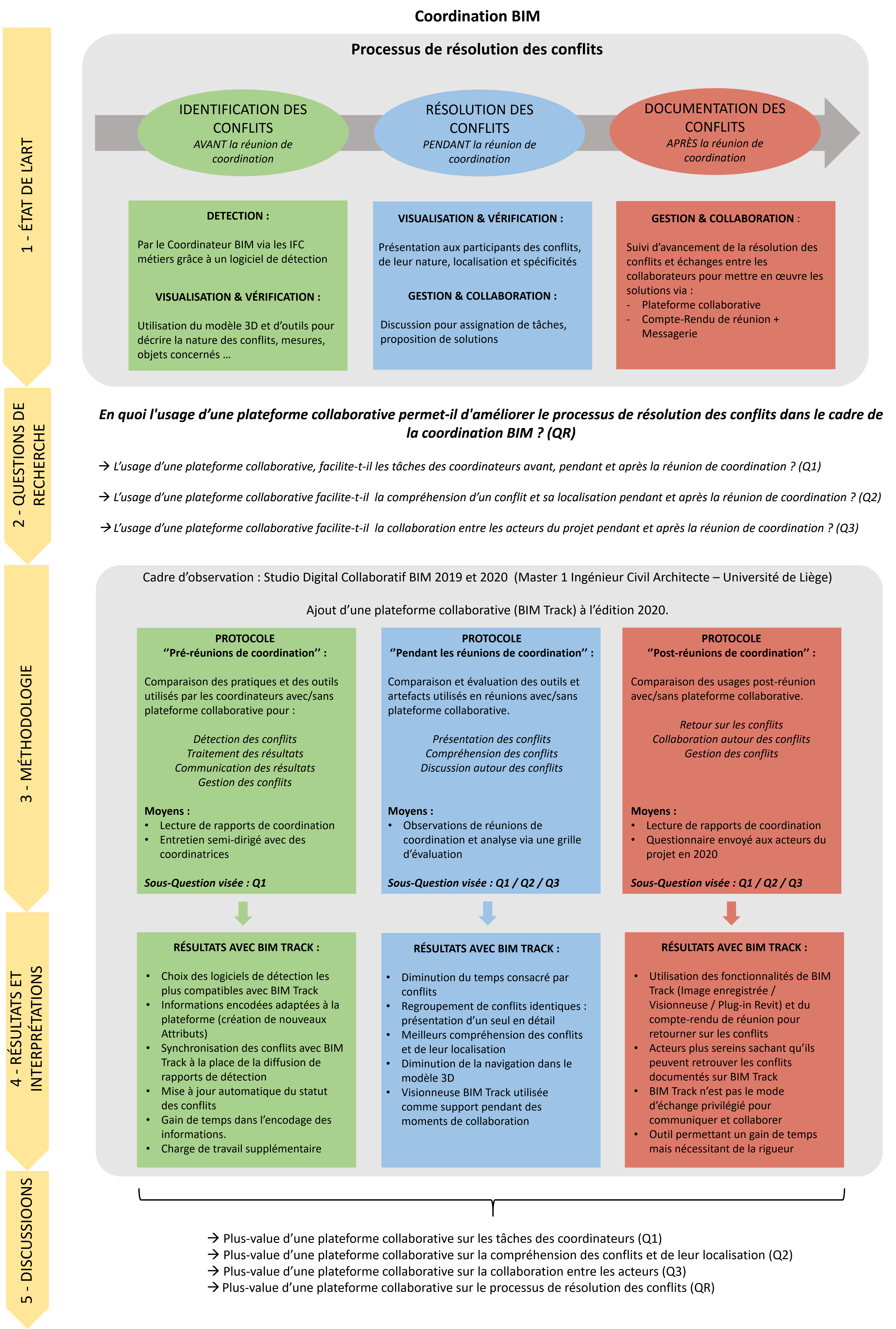 Ce travail interroge la plus-value de l’utilisation d’une plateforme collaborative en coordination BIM à travers sa question de recherche QR : En quoi l'usage d’une plateforme collaborative permet-il d'améliorer le processus de résolution des conflits dans le cadre de la coordination BIM ?